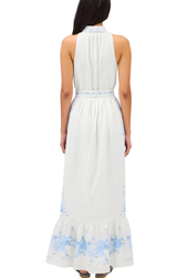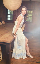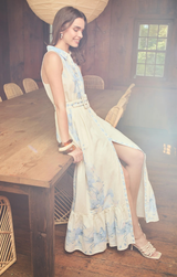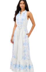 A dreamy and romantic maxi for your special summer events. The Juniper features a full button up front, collared neckline, sleeveless design, belated waist and an iris watercolor print. Style with heels and delicate jewelry for a party ready look.
