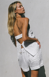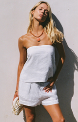 The Tessa Top delivers lightweight sophistication every time. Constructed in breathable 100% Linen, it features a strapless neckline, open back with tie, and an elastic ruched band at the back of the bust so it never slips down. Pair with the Lia Shorts for an easy set or simply style with your denim of choice.