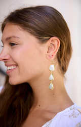 Elegant and luminous, the Esma earrings feature three cascading mother of pearl stones set in rich 18k gold-plated brass. Each stone catches the light with a soft iridescent glow while the textured gold edges add a touch of charm. Lightweight yet statement-making, they add sophistication to any outfit.