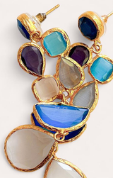 A striking cascade of color and shimmer, the Tayra earring feature a stunning mix of blue, aqua, and moonstone-like hues set in 18k gold-plated brass. each stone is framed in a textured gold edge, creating a look that's both bold and elegant. Lightweight yet eye-catching, they are perfect for dressing up a simple outfit or adding a statement touch to evening wear.
