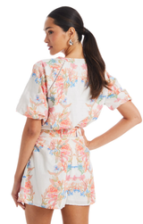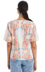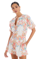 A custom floral print cut in a lightweight linen blend. This dreamy blouse is a summer staple. Whether you dress it up with the matching Tracy shorts or wear more casually with denim and slides, you will be loving this style all summer long. Featuring a boxy fit, split v neckline, raglan shoulder seems, and voluminous sleeve with elastic at the bottom.