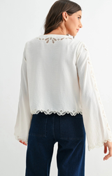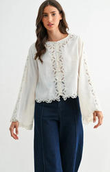 This sweet staple is the perfect year-round addition to your wardrobe. Featuring long bell sleeves, intricate scalloped lace embroidery, a soft drape, slightly textured finish, a round neckline and fabric-covered buttons down the front. Pair with slacks for a polished office look or create a boho-inspired ensemble with a dreamy maxi skirt.