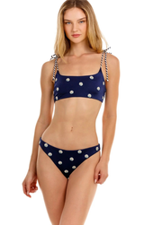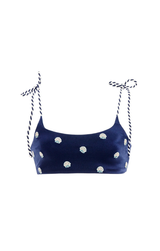 A shimmer must have! The Aya Sereia top embodies where coastal elegance meets effortless allure. Crafted from deep navy satin-look fabric, it features shimmering embroidered seashells. Featuring a scoop neck and twisted rope straps that tie delicately at the shoulders, while the back S-hook closure ensures a comfortable and secure fit.