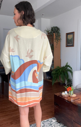 A dreamy summer tunic style dress featuring a wavy earthy toned print, wide quarter sleeves, tie up neckline, and a flowy mini length. Style up with heels or wear casually with slides and gold jewelry.