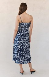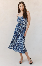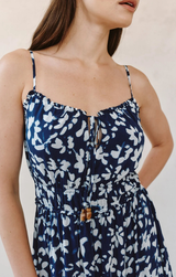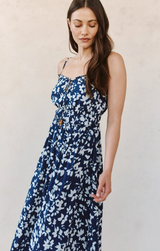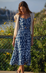 Effortless elegance meets playful comfort in this midi dress. The adjustable tie neck lets you customize your neckline for the perfect fit, while cami straps you can adjust ensure everything stays exactly where you want it. An elastic waist cinches gently to define your shape without any fuss, creating a flattering silhouette that moves with you. The enchanting Indigo Bloom print brings a fresh, botanical vibe that feels both romantic and modern. Dress it up or down, this versatile piece is ready for whatever your day brings.