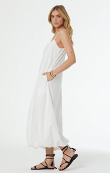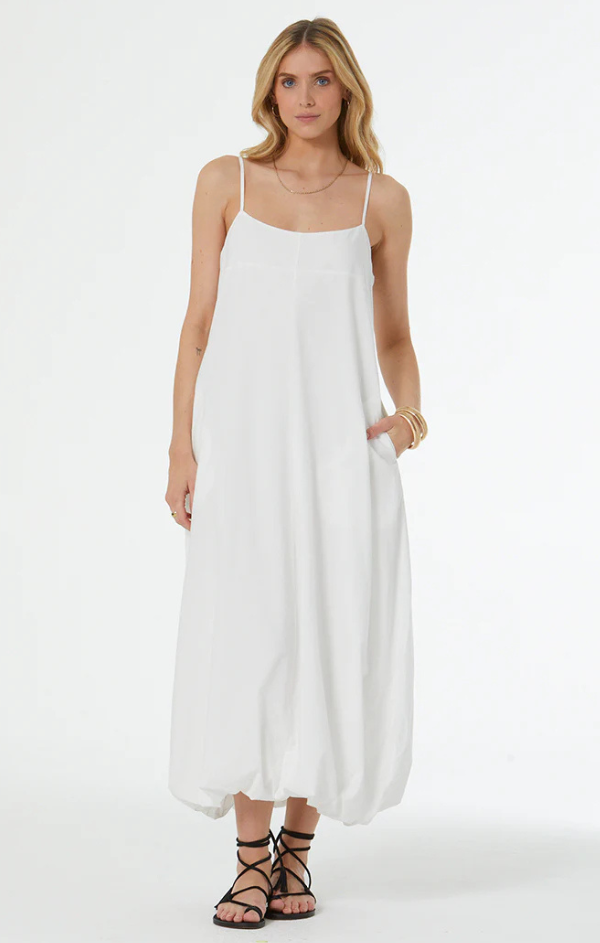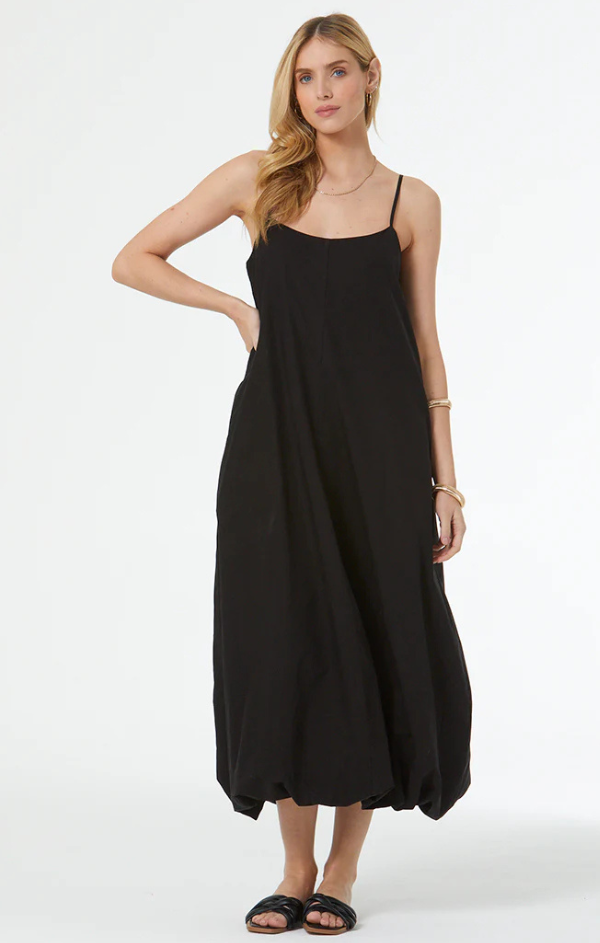 A classic midi with a modern twist. Featuring a slight scoop neckline, thin straps, dramatic bubble hem and a relaxed fit. Style with gold hoops and a cute clutch for a weekend ready look.