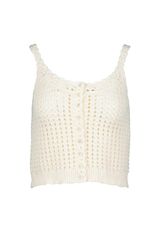 A dainty crochet knit tank to style endlessly all summer long. Featuring a button up front, open crochet knit, scoop neck, scallop trim and an off white hue. Style with a  flowy skirt or wide leg printed pants for a classy summertime vibe.