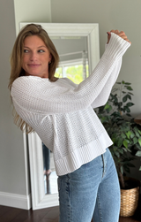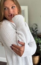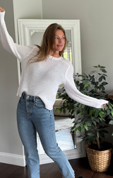 The perfect layering knit to style year round. Throw on over a bathing suit for a sheer like beach knit coverup or wear with denim and sneakers for an everyday on the go vibe. Featuring an open knit design, crew neck, long sleeves and relaxed fit.