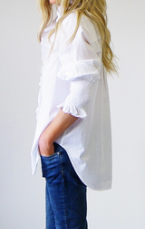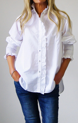 The Poppy offers pure crispy cotton with a feminine touch. Featuring an eye-catching ruffled button-up front and collar detail, unique sheering cuffs, and scooped back. Style with jeans, maxi skirts, and shorts alike- the Poppy shirt is designed to go from the office to a casual day out in a flash!