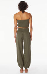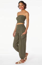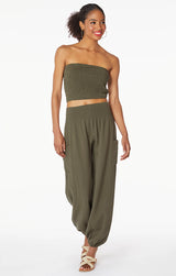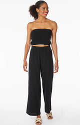 We love an easy tube tank for the hot months of summer. This cute and casual top features a fully smocked bodice, strapless style and cropped. Style with the matching pants and a slides for a laid back summertime look.