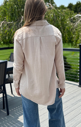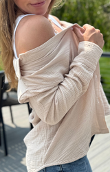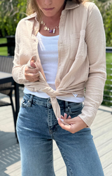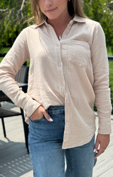 From the transitional seasons to the warmer months, this breathable top is perfect for daily wear, everywhere! Featuring a classic collared neckline, functional button front closure, long sleeves, and relaxed fit, all finished in breathable textured cotton gauze. Pair with the coordinating Cropped Wide Leg Pant for an easy summer set, or simply style with your denim of choice.