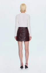 The Abi Mini Skirt features a flattering high rise and a timeless mini silhouette. Finished in a Cabernet, deep burgundy hue that adds rich sophistication to any outfit. Pair with the Valerie Faux Leather Jacket for a gorgeous matching set,