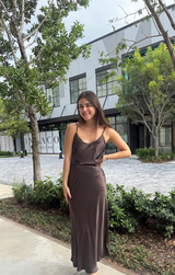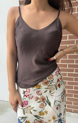 This silky soft stunner is designed to add versatility to your year round wardrobe! Featuring a classic V neckline, relaxed fit, and adjustable spaghetti straps that create your perfect fit. Pair with the Silky Slip Skirt in Chocolate Brown for a sweet set, or simply style with your favorite denim.