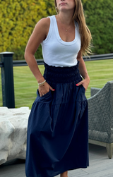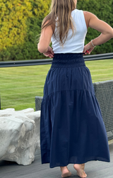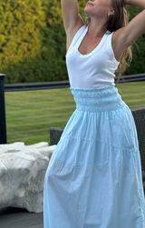 The Athena skirt is made to float in a summer breeze. Featuring a wide shirred elastic waistband, flattering tiered construction, maxi length, and breathable fabric to keep you cool all summer long. Try pairing the Athena with a fitted tee for a causal look, or dress it up with your favorite bodysuit and strappy heels.