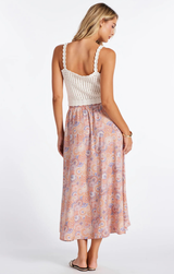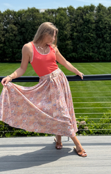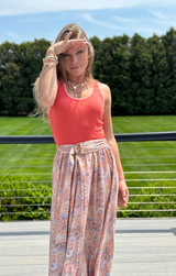 A flowy and free summer skirt we all need in our daily rotation. Featuring an adjustable belted waist super flowy body and a unique mosaic print. Style with tie up sandals and a fitted tank.