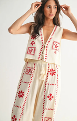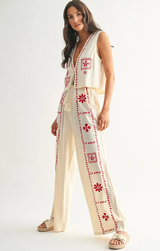 The Chloe Set takes the guesswork out of your summer styling! Featuring an intricate embroidered pattern, wide leg high waist pants with a drawstring waistband, and a vest-style self-tie top to pair perfectly. Style with a raffia handbag and strappy sandals for your next warm-weather outing!