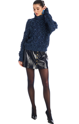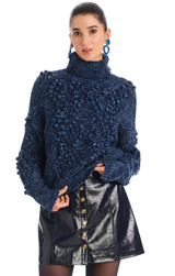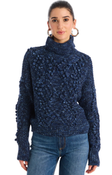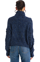 A cute everyday knit with playful hand-stitched pom poms and a slouchy, relaxed fit for a cozy look. Featuring a folder turtleneck, cable knit detailing, midnight space day and a warm comfy knit fabrication. Style with denim jeans and boots.