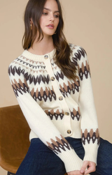 You can never go wrong with a faire isle inspired knit for the winter season. Featuring a cardigan design, long sleeves, ribbed details and relaxed fit. Style with everyday denim and boots for a styled up vibe.