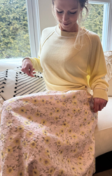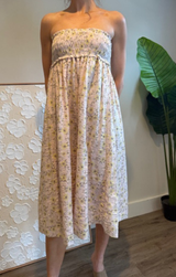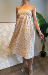 A dreamy spring forward midi skirt featuring a smocked waistline, dainty floral print, flowy body and a pull on style. This can be styled as a skirt and a strapless dress for any vibe. Wear with heels or tie up sandals for a fresh party look.