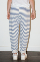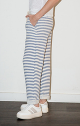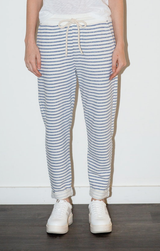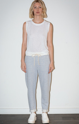 A cute and classically striped jogger pant to lounge in all year round. These make a perfect transition piece for the warmer weather. Featuring a soft navy stripe, cuffed hem, drawstring waist and a relaxed fit.