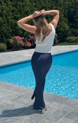 A sleek and chic buttery soft maxi skirt for your warm weather looks. Featuring a bold side slit, fitted body and a pacific blue hue. Style with a cropped ribbed tank and slides for an easy summer vibe.