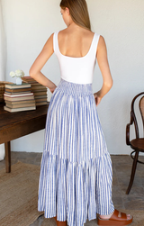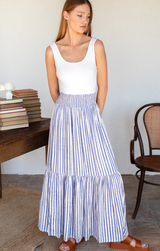 The Shirred Skirt is your breezy escape in fabric form. With its relaxed elastic waistband, flowing tiered maxi length, and soothing ocean stripe, this is the piece you'll reach for when warm weather calls. Pack it for your next getaway or wear it now, either way, you're ready to unwind in style.