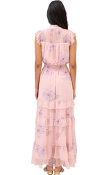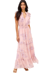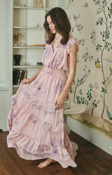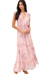 A charming maxi with delicate and feminine florals. The Hazel features flutter sleeves, a fluid moving tiered maxi skirt, cinched waist, pintucking details at the yoke with a split V neckline, and covered buttons at bodice. Style up with heels and a woven clutch for a party ready look.
