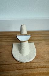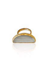 Radiant and refined, the Lunar Ring makes a luminous statement. handcrafted from 18k gold-plated brass, it features a smooth half-circle Cat's Eye Stone that glows with elegance. Its bold silhouette and adjustable fit make it the perfect finishing touch for any outfit.