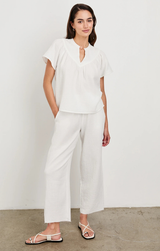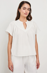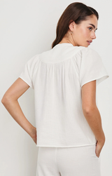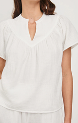A breezy babydoll style top crafted from a soft, double-gauze cotton. Featuring a v neckline, flared flowy sleeve and a relaxed and airy fit. Style with the matching Leighton Shorts and sandals for a loungey summer look.