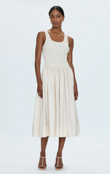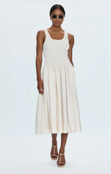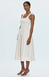 A classic style day dress crafted from a lightweight fabric and perfect for everyday wear. Featuring a smocked tank style bodice, flowy midi skirt and an easy flattering fit. Style with sneakers and a denim jacket or dress up with heels and gold hoops.