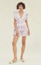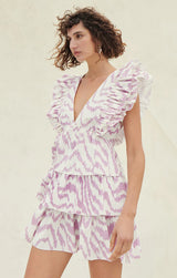 Calling all the animal print lovers! Featuring a flutter sleeve, v neck, ruffle mini skirt and printed with a zebra motif. This dress perfectly blends animal print & pastel spring hues, making it a natural pick for any dressy event you have this season.