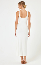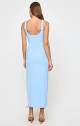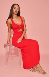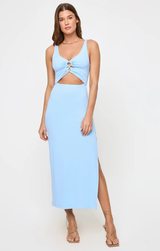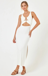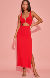 A summer staple to dress up or wear with your everyday rotation. Featuring flirty front loop cutouts, a scoop neck, side slits and thick straps. The fitted ribbed knit is ultra flattering, hugging your curves in all the right places. Style with strappy heels and gold jewelry for a warm-weather ready look or style over your bathing suit with sandals for a casual summer look.