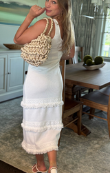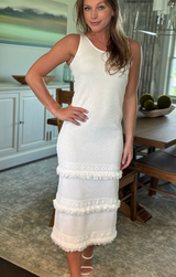 The perfect boho maxi dress for the warm weather. Featuring a flattering ribbed body, tiered fringe details, and a soft off white hue. Style with sandals and statement earrings for a fun summertime vibe.