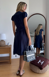 This versatile wrap dress can be worn in every way, everywhere. Featuring a weighty cupro blend construction that drapes the form effortlessly, a hem that falls just below the knee, a hidden snap closure at the neckline for the right amount of coverage, and a self-tie wrap style closure that can be tied in at least two ways so you can be both party ready and office ready. Dress it down with a denim jacket and sneakers, or style up with heels and gold jewelry.