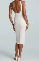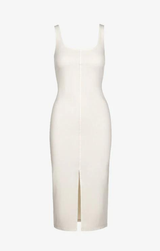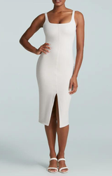 The look and feel of denim with a four-way stretch and an ultra-soft feel. This bodycon midi dress is ultra flattering and a sexy date night style. Featuring a square neck, thick straps, front slit, fitted body and a porcelain white color.