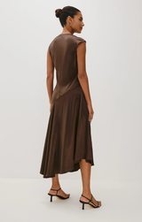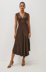 Stunning in satin, the Eleni Dress is a chic choice for your next fall event! Featuring a satin crepe construction, cap sleeves, elegant shirring details, and an asymmetrical skirt, all finished in an on-trend espresso brown. Style with strappy heels, gold jewelry, and a beaded purse for a timeless ensemble.