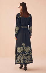 The Emma Maxi is the perfect combination of a comfortable feel and a polished look. Featuring a full front button closure with collar, a slit at just the right height, a removable tie waist belt that creates a flattering shape, and long sleeves with interior tab for cuffing. Style with a leather handbag, boots and gold hoop earrings.