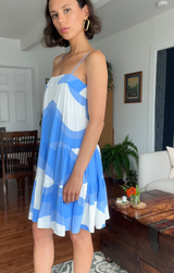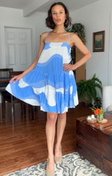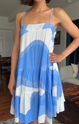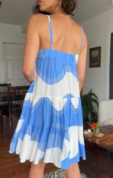 A fun summer mini to dress up or wear causally. Featuring a square neckline, thin straps, mini flows tiered skirt and a wavy blue print. Style with heels and a cute clutch or slides and a denim jacket.