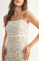 This eye-catching maxi is the perfect piece for your summer closet year after year. Featuring spaghetti straps, ric-rac detailing throughout, and intricate crochet lace detailing. Style with strappy sandals and a beaded handbag for a resort-ready ensemble!