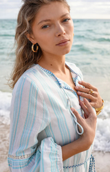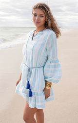 Embrace charm with this breezy summer dress, crafted from a soft cotton-linen blend. Light and airy, it pairs gentle stripes in shades of blue with a relaxed silhouette, featuring balloon sleeves and a floaty shape that can be cinched with the optional braided belt. Perfect for warm days, this dress is graceful, comfortable and endlessly wearable.