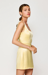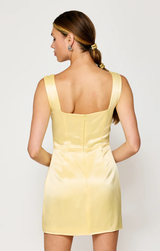 This sunny yellow mini is giving us refreshing warm weather vibes. Featuring a square neckline, sleeveless design, flirty mini length, hook and eye hidden back zip, and flattering cinching at the waist, all constructed in a gorgeous mid-weight satin effect fabric. Style with heels and gold jewelry for a summer night out.