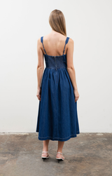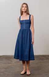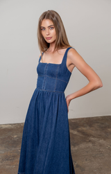 An ultra flattering denim style midi to dress up and down all summer long. Featuring a fitted hook front bust, square neckline, flowy midi length and easy adjustable straps. Style with cowgirl boots and hoops for a fun and styled up summer vibe.