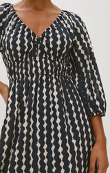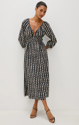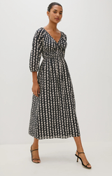 All day comfort in The Paio dress. Featuring a wide variety of neckline, elasticated bracelet-length sleeves and a hook-and-eye front closure. The painted noir print gives this a fun and playful yet classy vibe. Style with heels and chunky gold earrings.