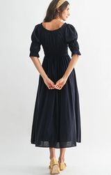 Romantic and timeless, this midi dress features a soft off-shoulder smocked neckline with delicate smocking that flatters the waist. Crafted from a lightweight, flowy fabric, this midi dress drapes beautifully with a feminine silhouette. The puff sleeves and adjustable front tie add a touch of charm, making it perfect for both casual afternoons and dressed up evenings.