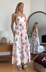 This gorgeous maxi is ready to go from brunch to beachside! Featuring a babydoll silhouette, flowy tiered maxi skirt, adjustable spaghetti straps to create a custom fit, and flattering back smocking, all constructed in breezy 100% cotton adorned with a darling seashell print. Style with a sunhat, sandals, and sunglasses for your newest go-to summer look.