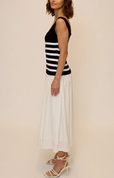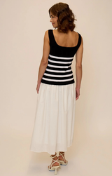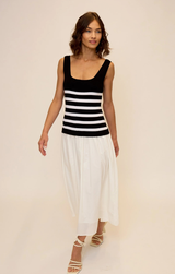 Perfect comfy - chic combo going on here! This layered look midi dress features a tank style top with a flowy midi length skirt. With a flattering black and white stripe and classic square neckline. Dress up with heels and hoops or wear casually with slides and a crossbody.