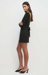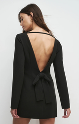 A statement take on the "little black dress". The polished front is a classic mini dress style with long sleeves and sleek boat neck. The back features a deep v and sweet bow detail. Style this up for your next wedding weekend or holiday party.