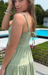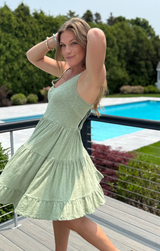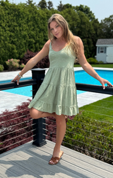 An ultra flattering a-line silhouette and a fresh juniper color for the sunny season. Featuring a scoop style neck, thin straps, tiered mini skirt and a lightweight cotton jersey. Style with sandals and a gold necklace.