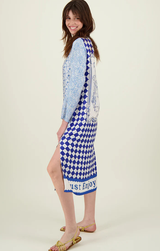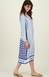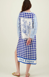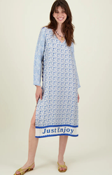 Breezy, bold and effortlessly chic, the Violet V Neck Dress is a statement piece you need in your closet. Featuring a relaxed v-neckline silhouette with long sleeves, this dress is made with intricate coastal blue patterns that give it a fresh Mediterranean feel. The playful "Just Enjoy" hemline and the striking patterned back adds a unique touch. Style with a straw tote and sandals for vacation days, or pair with sneakers and bold accessories for an elevated casual look.