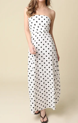 Effortless summer elegance meets timeless style in this strapless maxi dress. Crafted from a breathable cotton and linen blend, the fitted silhouette flatters your figure while the classic polka dot pattern adds playful charm. Perfect for warm-weather occasions, from casual outings to evening events. The strapless design offers versatility for layering or showcasing your shoulders. A wardrobe essential that transitions seamlessly from day to night.